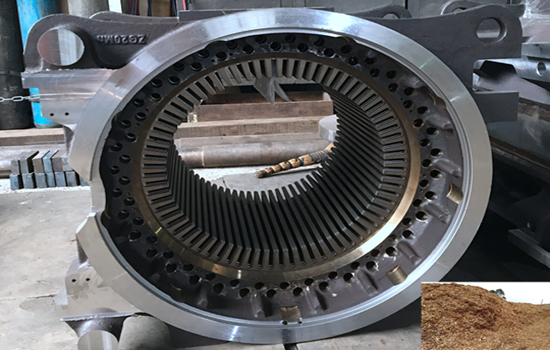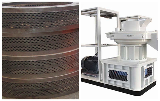 首先,在選用優質環模的前提下,應根據生產物料的比重,選用合適的模孔形式、開孔率及壓縮比。在保證環模強度的前提下,盡量提高環模的開孔率,對于有些品種的物料,在保證合理壓縮比的條件下,環模過于壁薄,以致環模強度不夠,生產中會出現爆模現象,應當在保證模孔有效長度的前提下,增加環模的厚度和增開減壓孔。